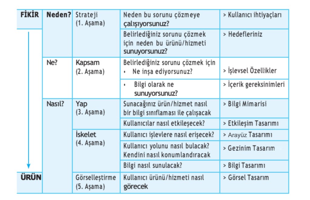 Kullanıcı deneyimi tasarımı ardışık aşamalardan oluşan bir süreçtir. Her bir aşamada farklı bir sorunun yanıtı aranır. Aşamalar soyuttan somuta doğru ilerler ve her bir aşama bir öncekinin üzerine inşa edilir. Strateji aşamasında kullanıcı ihtiyaçlarına göre hedefler belirlenir. Kapsam aşamasında ürününün/hizmetin işlevsel özellikleri ortaya konur. Yapılandırma aşamasında sistemin bilgi mimarisi oluşturulur ve nasıl çalışacağına karar verilir. İskelet aşamasında ana taslağı inşa edilir ve son aşamada görsel tasarımı yapılır.
